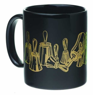 Siyah, üzerinde altın rengi el zilleri baskılı kupa.