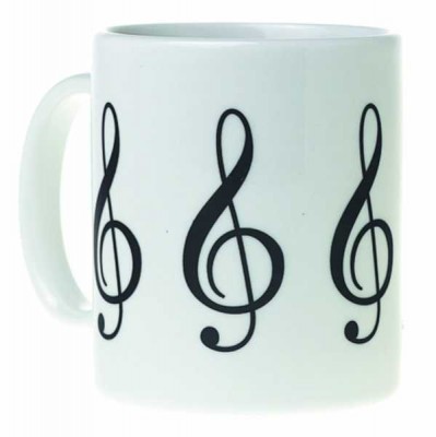 Üzerinde siyah sol anahtarı baskıları olana, beyaz porselen kupa.