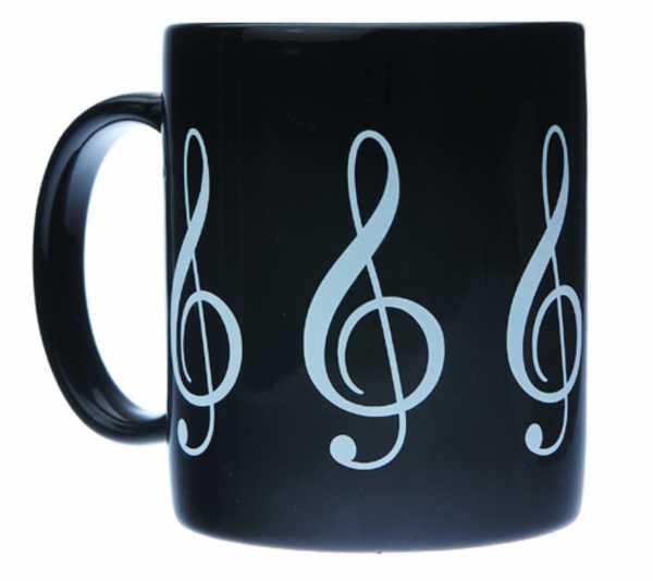Üzerinde siyah sol anahtarı baskıları olana, beyaz porselen kupa.