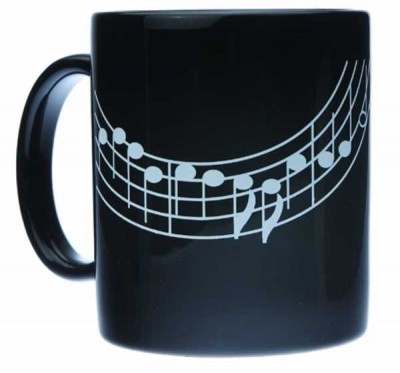 Üzerinde beyaz porte üzerine yazılı nota baskıları olan, siyah porselen kupa.