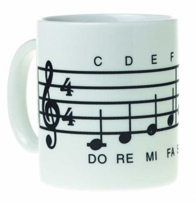 Üzerinde porte ve portede sıralanmış notaların bulunduğu, beyaz porselen kupa.