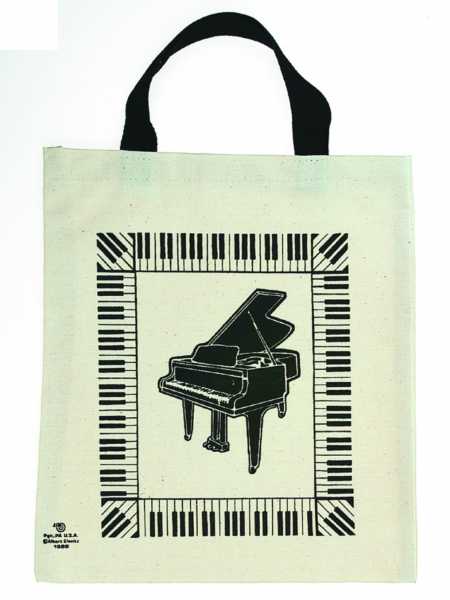 Üzerinde kuyruklu piyano ve piyano tuşesi olan, beyaz, koton (%100), bez çanta. Boyut: 30.48 x 35.56 cm (12x 14)