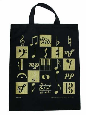 Üzerinde altın rengi müzik motifleri bulunan, siyah, koton (%100), bez çanta. Boyut: 38,1 x 48,26 cm (15 x 19 inç)