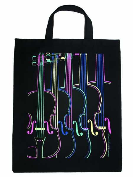 Üzerinde beş tane 4 renkli keman bulunan, siyah, koton (%100), bez çanta.