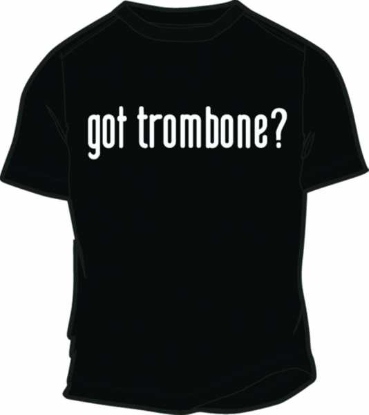 Beyaz renkli "Got Trombone" yazısı baskılı kısa kollu yuvarlak yaka siyah tişört.