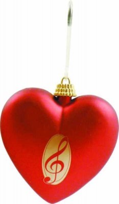 Üzerinde altın rengi sol anahtarı baskısı olan kırmızı kalp şeklinde yılbaşı ağacı süsü.