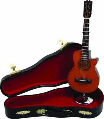Özel kutusunda, standı ile birlikte kahverengi minyatür akustik gitar. Boyut: 17,78 cm (7 inç)