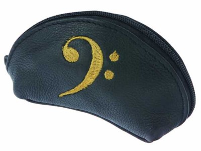 Siyah, üzerinde altın renkli fa anahtarı baskısı bulunan, küçük deri bozuk para çantasına bağlı anahtarlık.