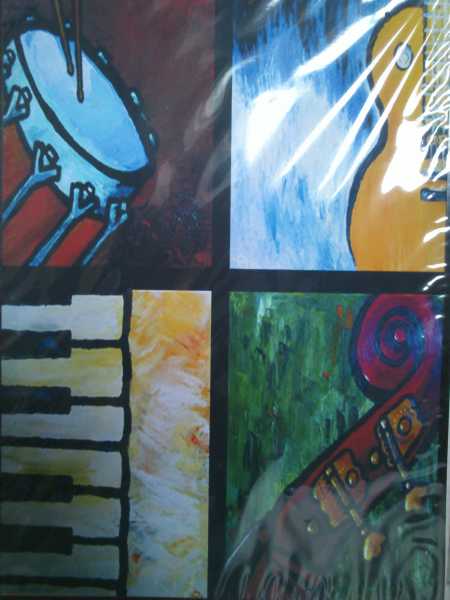 Dört bölüme ayrılmış ve her birinde farklı enstrüman resimleri bulunan, plastik çerçeveli poster.
