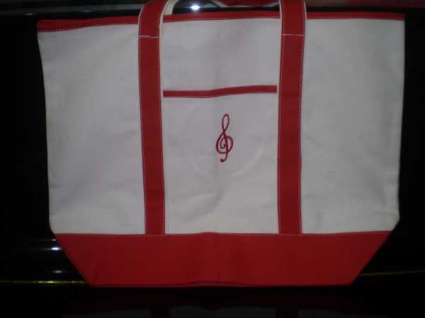Kırmızı saplı, beyaz üzerinde kırmızı sol anahtarı bulunan çanta
