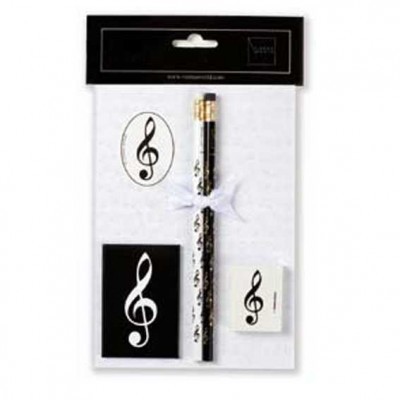 İçinde sol anahtarlı siyah-beyaz iki kurşun kalem, sol anahtarlı bir silgi, sol anahtarlı magnet ve bir not defteri bulunan sol anahtarlı kırtasiye seti.