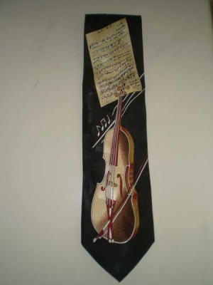 Lacivert üzerine keman ve nota desenli poliester kravat.