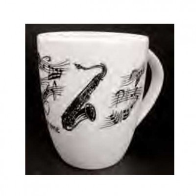 Beyaz seramik üzerine siyah saksafon ve nota desenli kupa.Bulaşık makinesinde yıkanabilir.
