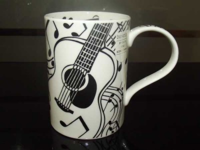 Beyaz porselen üzerine, siyah nota ve gitar işlenmiş kupa.Bulaşık makinesinde yıkanabilir.