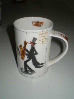 Beyaz porselen üzerine , renklerle işlenmiş saksafon çalan adam desenli kupa.