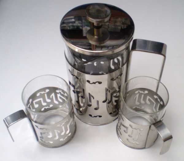 Cam üzerine nota delikli metal kaplama. Bardak boyut: 9 cm. Çap:6 cm. French Press Boyut: 16 cm. Çap:9 cm. 2 bardaklı set.