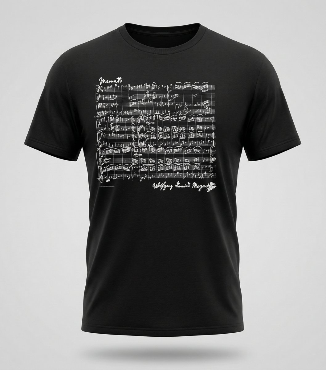 Bu özel tasarım tişört, Mozart’ın ikonik eseri “Eine kleine Nachtmusik”’e ait nota detaylarını modern ve sofistike bir stile dönüştürür.