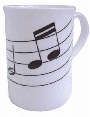 Dalgalı porte üzerinde notalar olan beyaz porselen kupa. Mikrodalga fırın ve bulaşık makinasında güvenle kullanılabilir.
