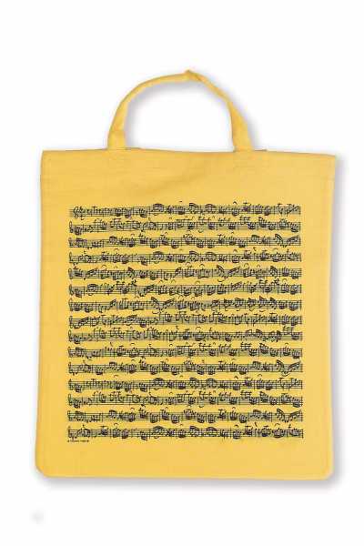 Yüksek kaliteli koton kumaş üzerine Bach’ın “La Minor Keman Konçertosu” notaları baskılı sarı renkli çanta. Notalar her iki yüzde de mevcuttur. Günlük kullanım için pratik bir aksesuar olmanın yanında, müzik sevgisi, zarafet ve kültür ifadesidir.