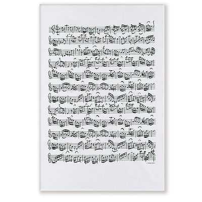 Pamuklu kumaş, beyaz renkli, notalı, mutfak için kurulama bezi. Boyutlar: 47 x 72 cm.