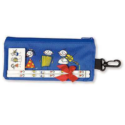 Mavi renkli, küçük çalgıcılar temalı fermuarlı bez kalemlik, çalgıcı çoçuklar temalı 2 kurşun kalem ve 1 silgi ile birlikte set.