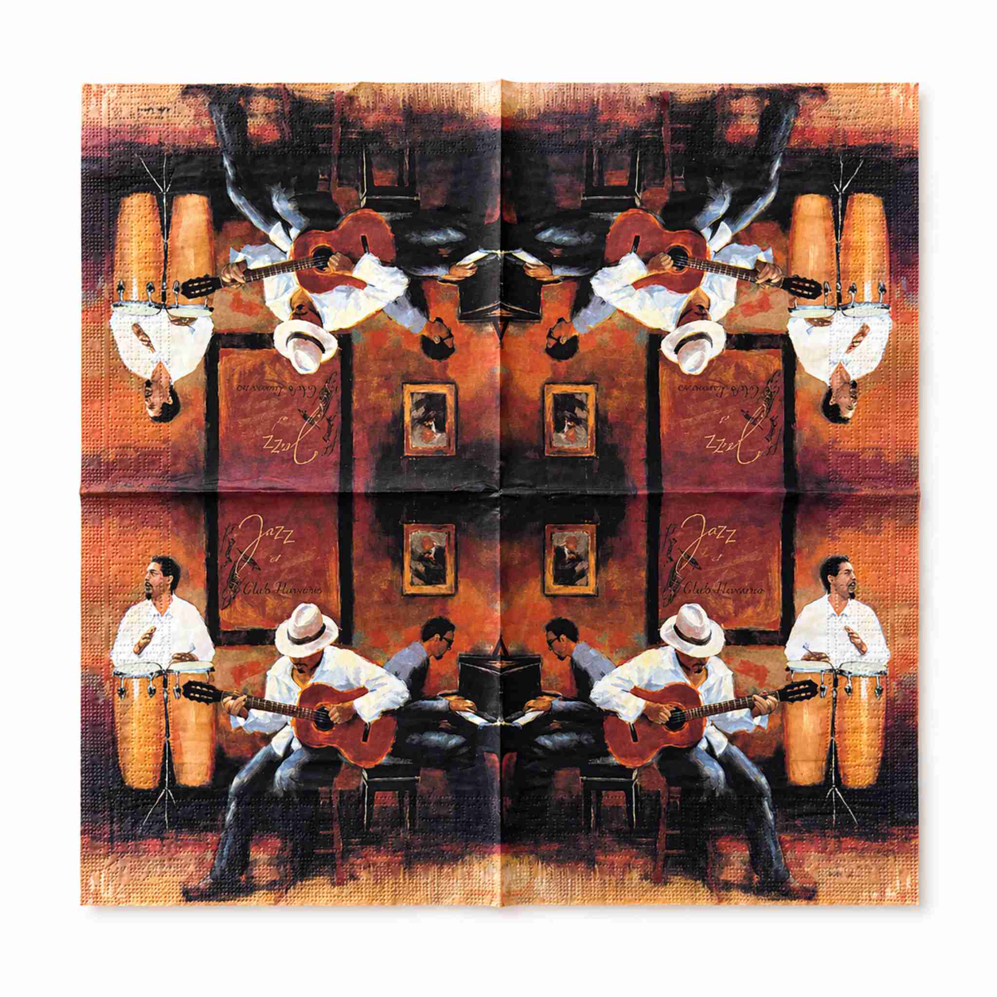 Müzik ve sanatın sıcak atmosferini sofralarınıza taşıyan özel tasarım peçete! Caz müzisyenlerinin yer aldığı sanatsal desenleriyle davetlerinizde fark yaratır.